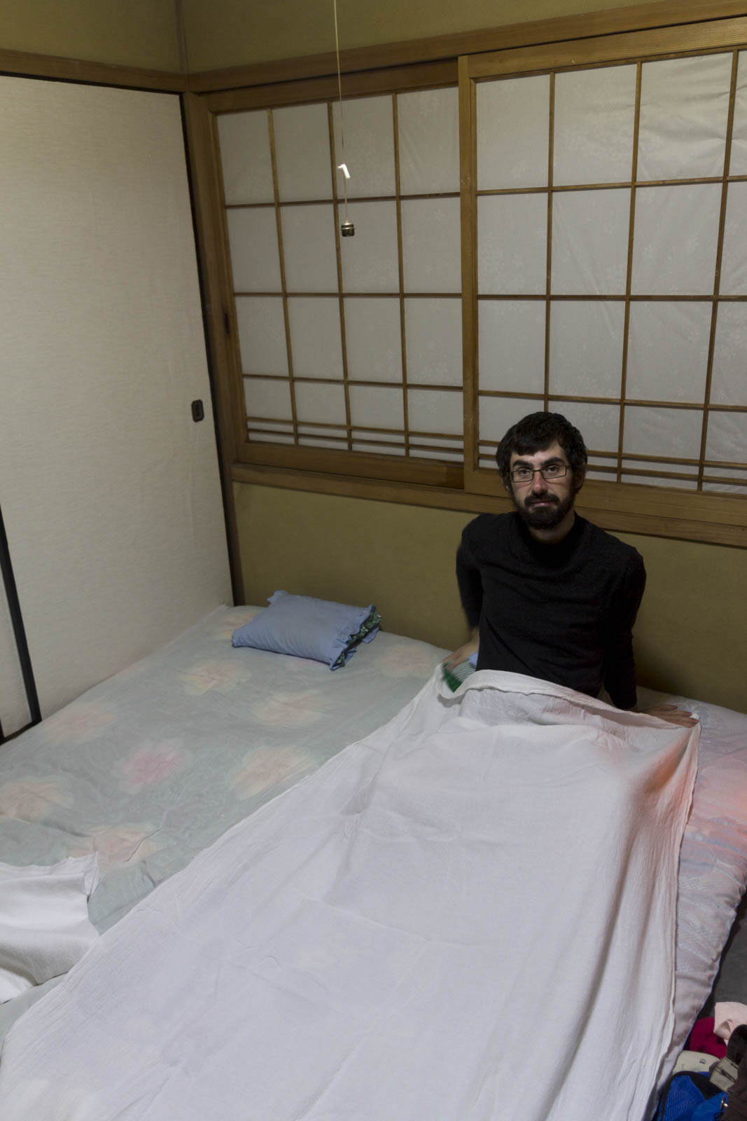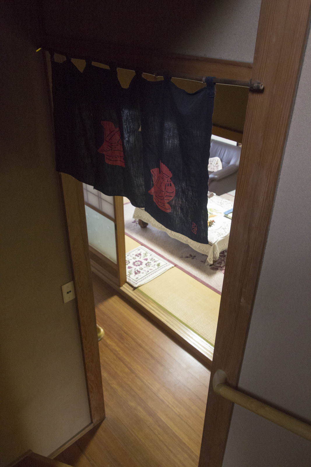 Arrivée chez lui, on découvre une de ces maisons en bois traditionnelles. Elle est belle, simple, mais harmonieusement décorée. Les murs intérieurs sont tout fins, les fenêtres ont des rideaux de papiers, dans le salon on trouve un autel bouddhiste et de la calligraphie aux murs, dans notre chambre nous dormirons sur un futon, à côté d’une vitrine de poteries traditionnelles.