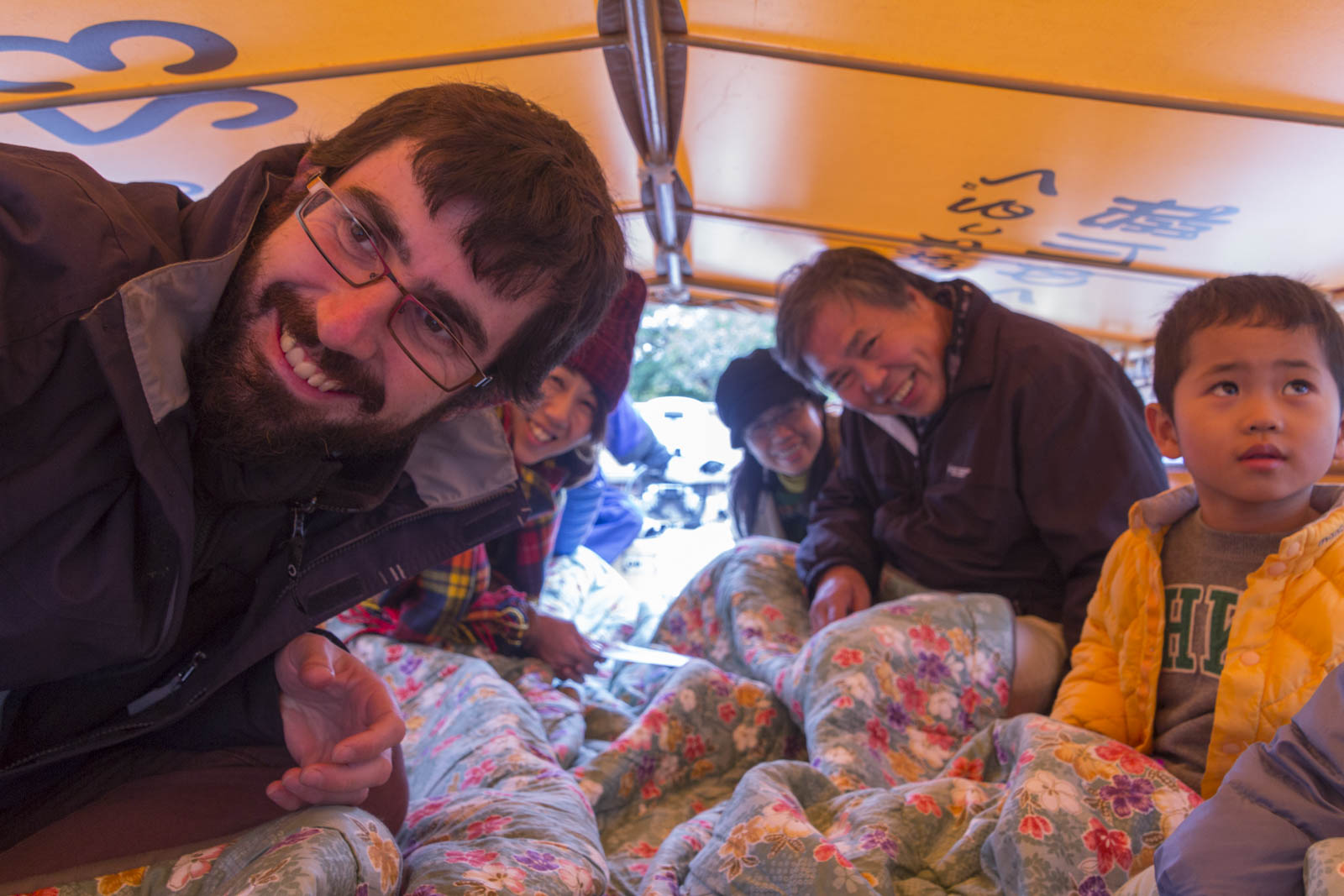 La décoration est sobre et épurée, l’ambiance chic et guindée. Tout le monde est très élégamment habillé, les hommes sont en costume, certaines femmes en kimono… et nous en chaussures de randonnée, sac à dos et polaire Quechua ! Tout le monde nous regarde, se demande ce qu’on fait là. On est les seuls étrangers. Une femme en face de moi fait remarquer à son voisin la taille et le manque d’entretien de ma barbe. Bref, on passe pour des extra-terrestres, mais qu’importe !