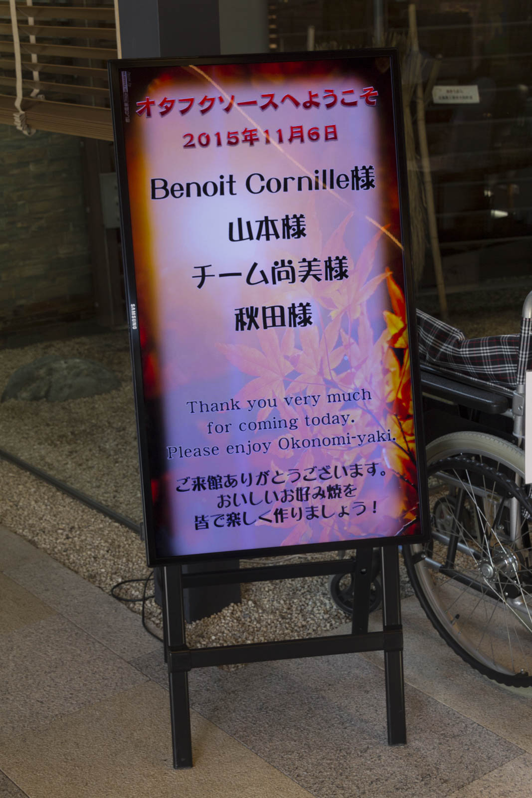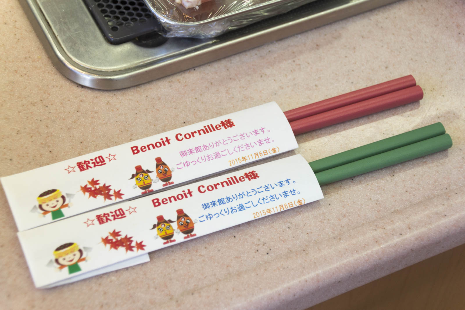 Mais là où ils sont vraiment très forts ces japonais c’est sur l’accueil. Quand on est arrivé, sur notre plan de travail, on avait des enveloppes de baguettes personnalisées à notre nom ! Et quand on est parti, un panneau de remerciement personnalisé. Grande classe.