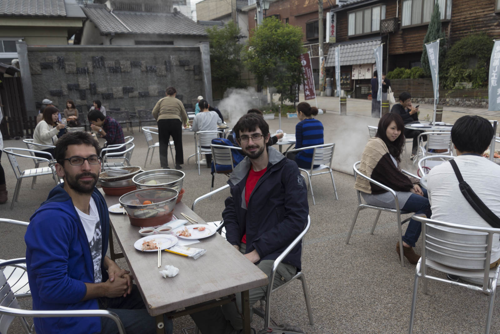 En plein milieu du quartier de Kannawa, le fameux quartier qui fume à Beppu, des stands de cuisson à la vapeur ont été installés, directement au-dessus d’une source chaude. Des sets tout fait, prêts à cuire, sont vendus sur place à un prix assez cher. En revanche, il est possible de venir avec sa propre nourriture, que l’on peut acheter au supermarché du coin. Là, c’est bien moins cher et on peut manger ce qu’il nous plaît !