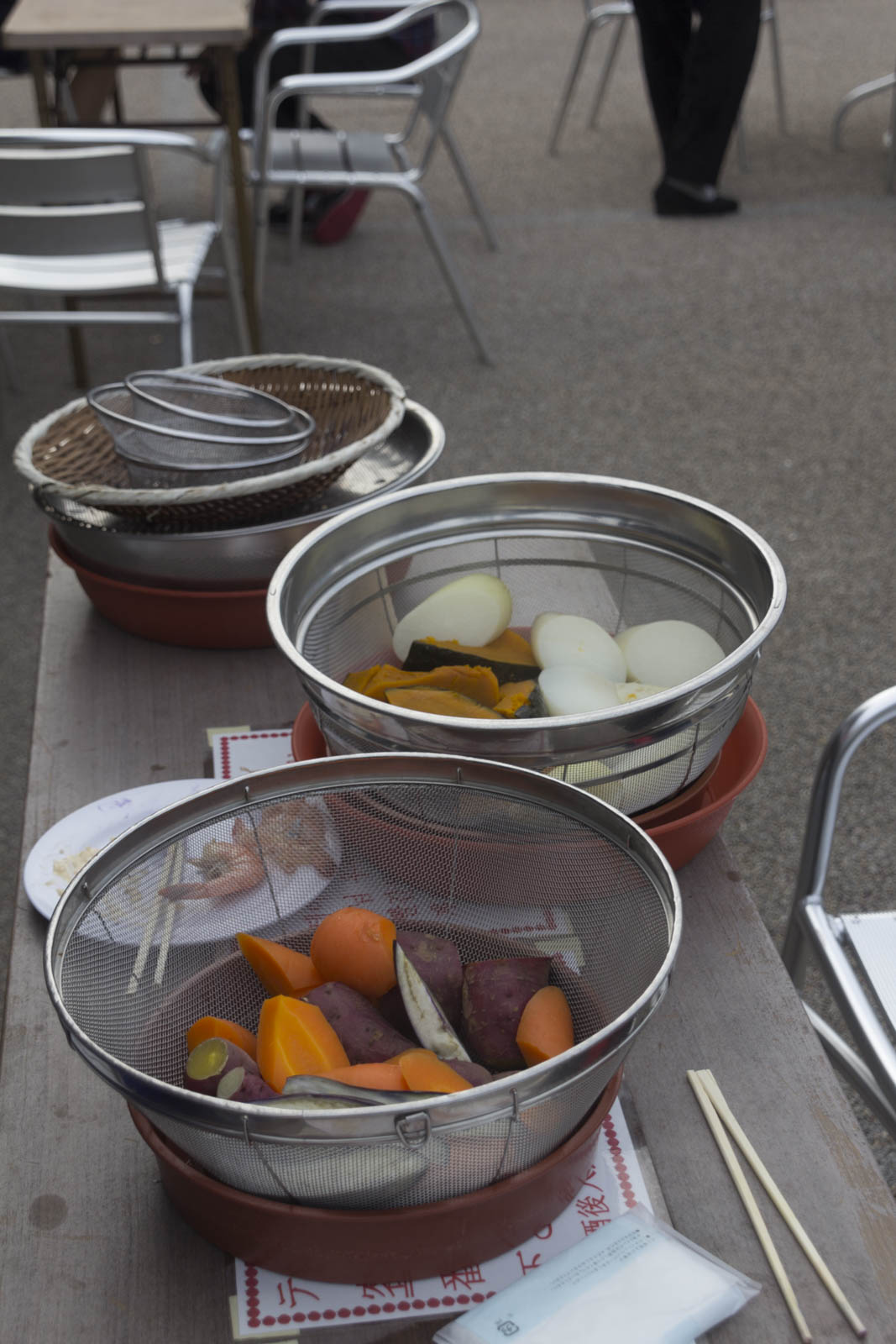 Pour Gagou et nous, ce sera une foule de légumes (patate douce, carottes, potiron, radis japonais, champignons et aubergines), accompagnés de quelques crevettes et coquillages. Et une sauce de type mayo légère, faute d’aïoli.