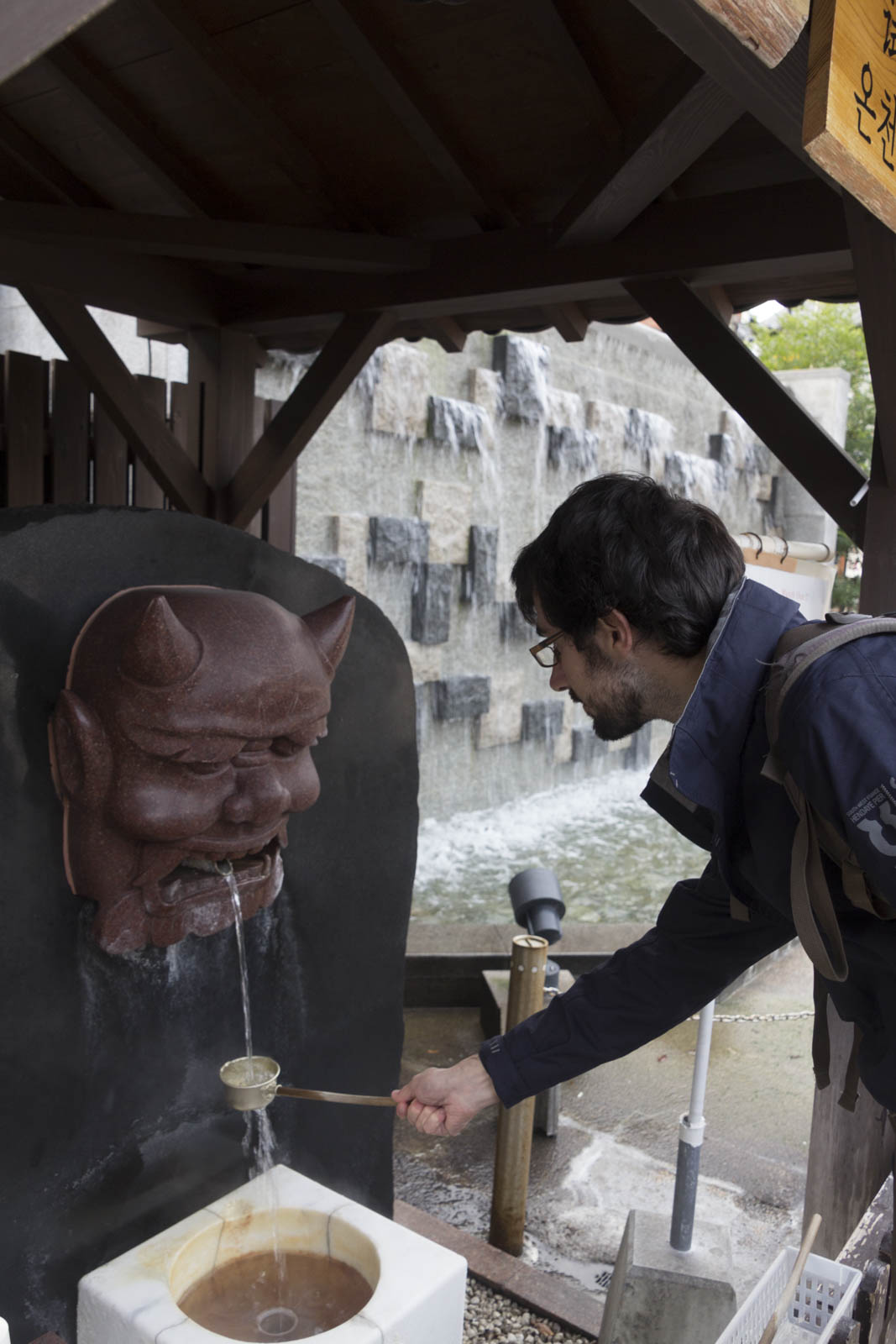 Finalement, la partie la moins inintéressante des jigoku est donc, peut-être, le bain de pieds. C’est une utilisation très courante des sources chaudes au Japon, que l’on avait déjà testée à Yuda Onsen, près de Yamaguchi. Ça se présente comme un petit bassin rectangulaire, d’une quinzaine de centimètres de profondeur, entouré de petits bancs en bois. Et on s’y installe pour y tremper les pieds dans une eau bien chaude. A Yuda Onsen, c’était même carrément brûlant, impossible de tenir très longtemps !