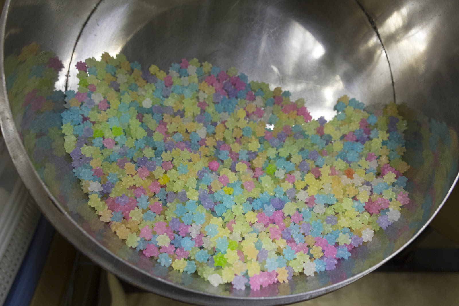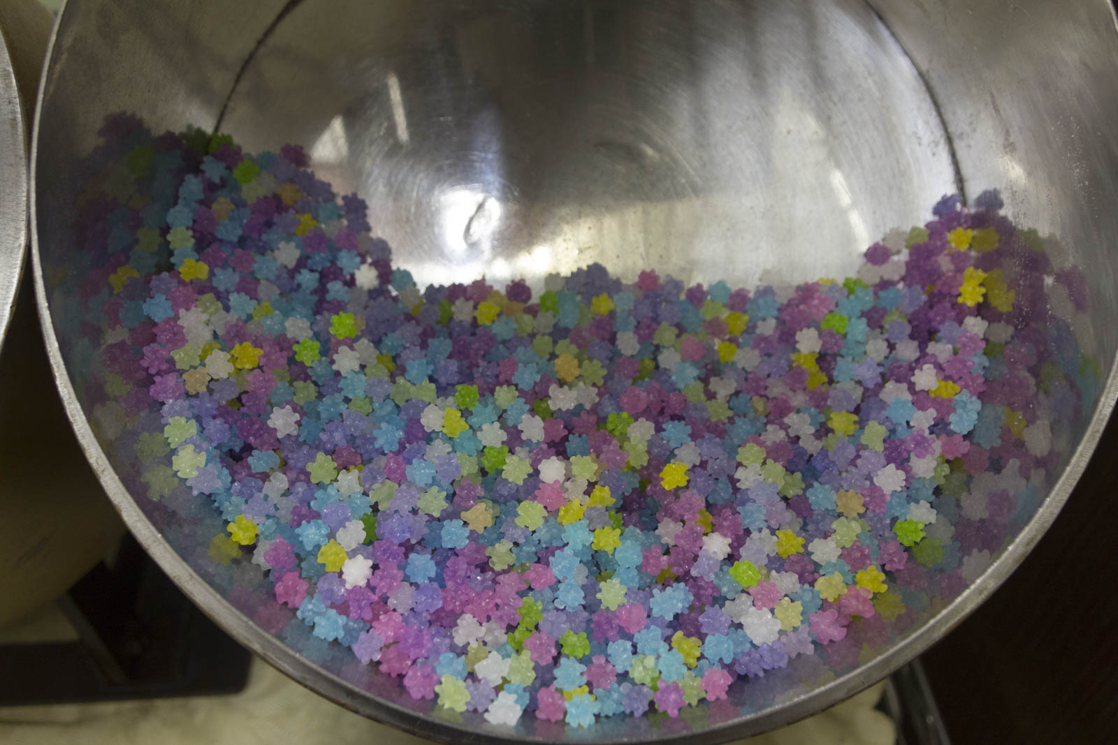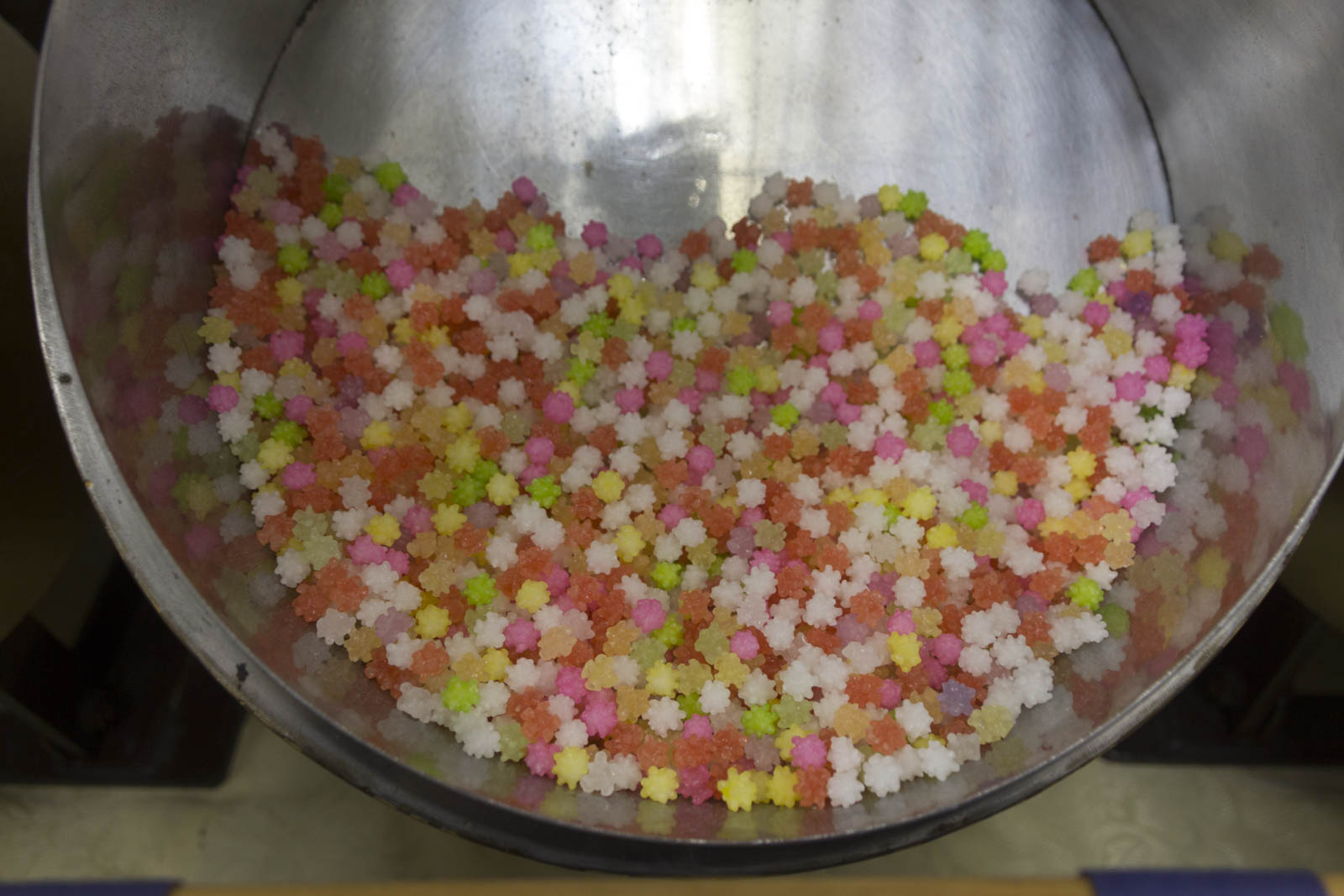 Mais ce qui fait la caractéristique des konpeito, ce sont ces petites cornes sur la surface du bonbons. En fait comme la poêle tourne de façon inclinée (30°), les bonbons chutent régulièrement les uns sur les autres et un peu de sirop non séché de l’un se transfère sur l’autre, créant une bosse. Et comme tout se passe très doucement (deux tours par minutes) la bosse a le temps de sécher un peu avant que le bonbon ne tombe à nouveau. Ainsi les bosses grossissent peu à peu pour créer la forme si étrange des konpeito.