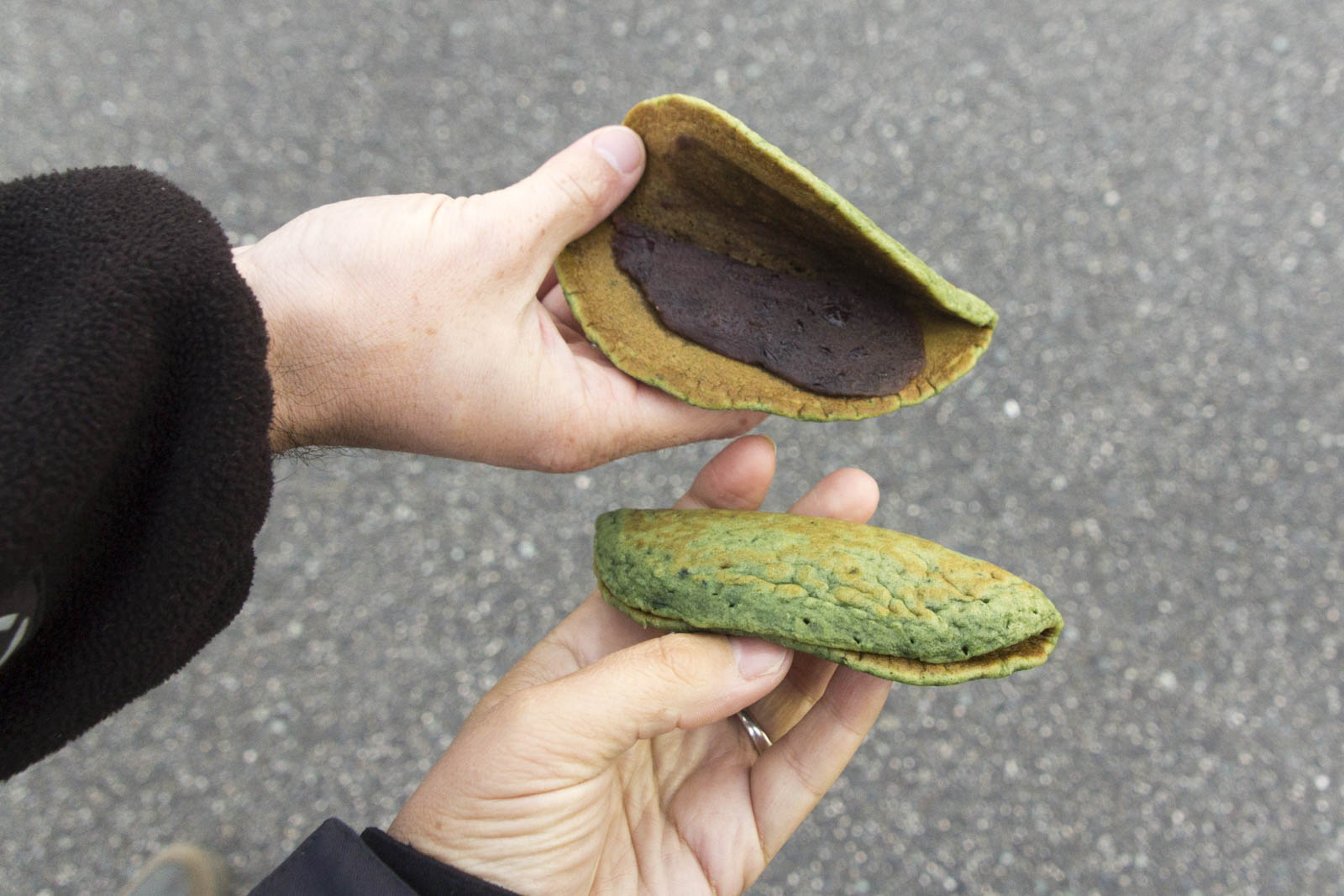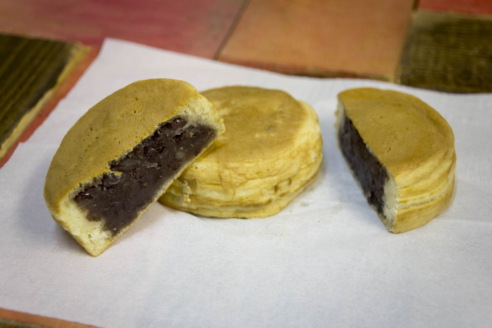 - Les dorayaki, un sandwich en pâte à pancake, parfois aromatisée au matcha, garnis d’anko. Existent aussi en version patate douce