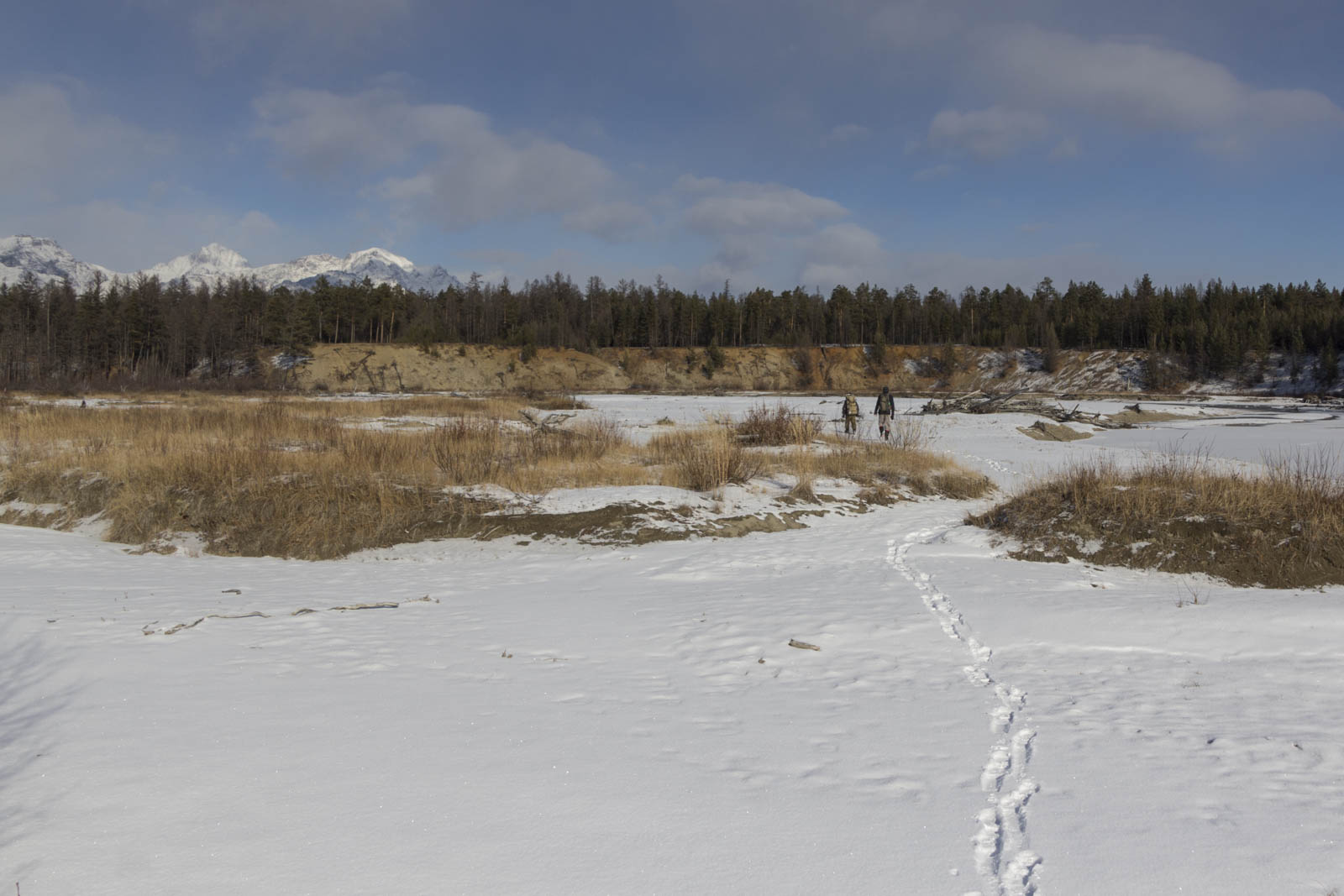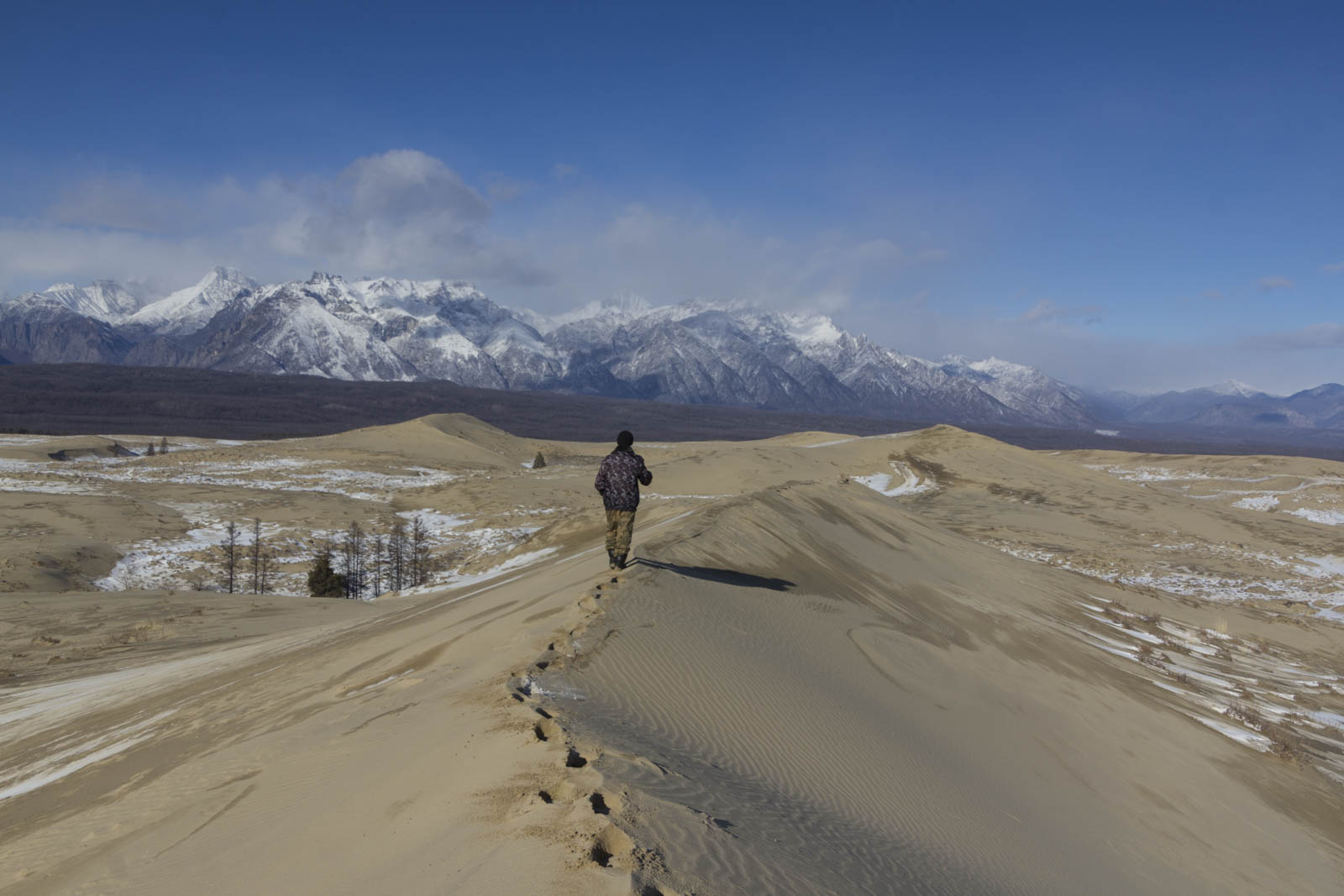 De l’autre côté de la rivière, on grimpe d’abord dans du sable, puis retrouve une forêt enneigée. Encore un petit bout de marche avant d’arriver devant un lac gelé, avec la chaîne du Kodar en arrière-plan. Magnifique, la magie de la Sibérie opère. Et ce n’est pas fini. Derrière une petite rangée d’arbre, de l’autre côté du lac, on commence à distinguer des nuances de beige. Sont-ce les fameuses dunes ?