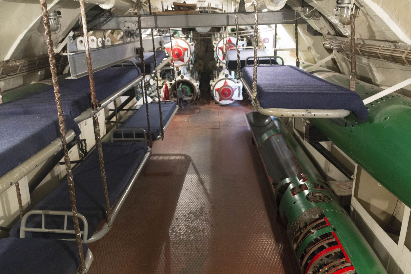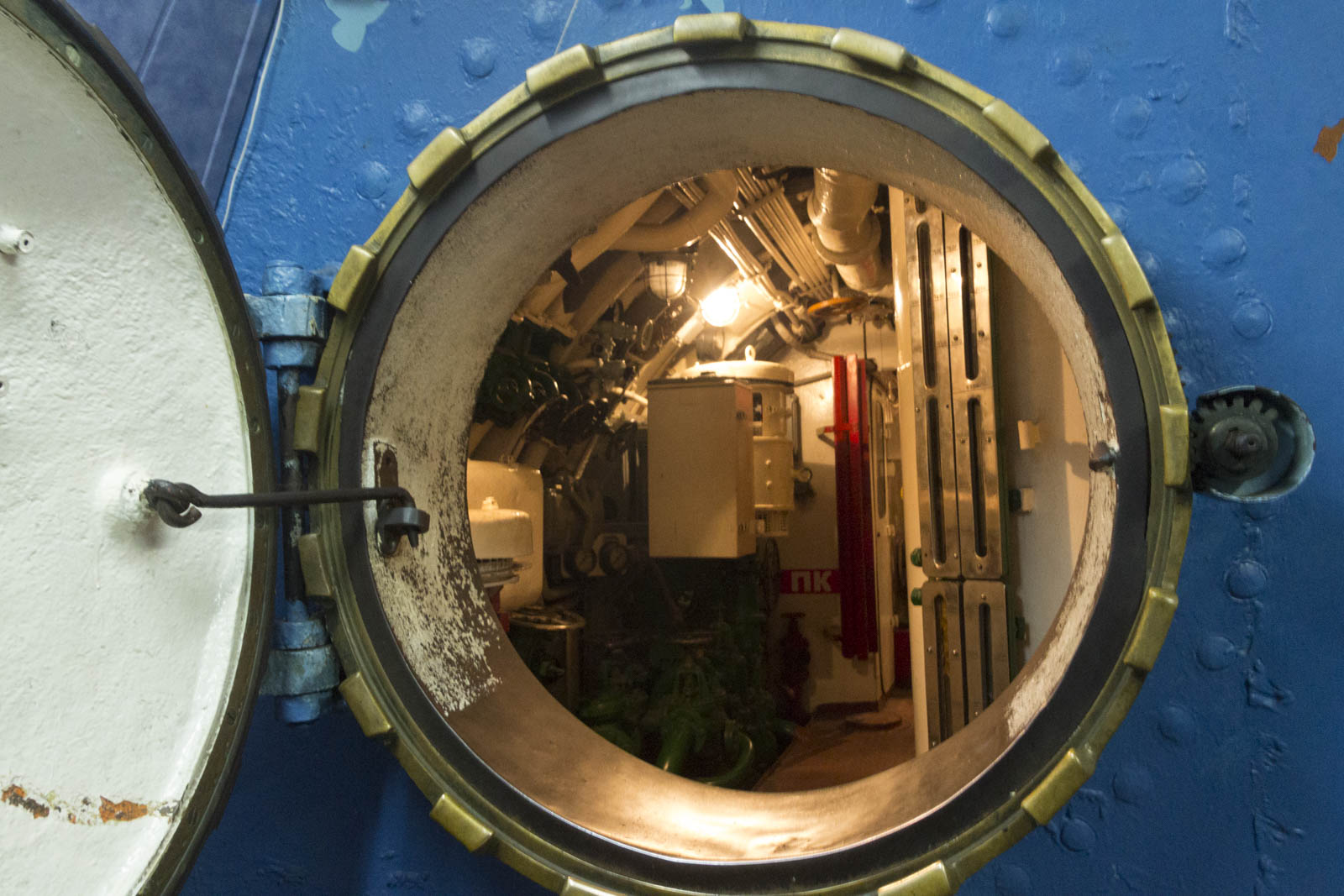 Puis dans la deuxième partie, on est vraiment dans le cœur du sous-marin, quasiment conservé tel quel. Quelle chance de pouvoir pénétrer ce microcosme, ce milieu ultra-fermé si mystérieux. La salle des machines ressemble à un trésor d’ingéniosité, avec tous ses tuyaux métalliques qui courent partout, et ses innombrables vannes. Puis vient le carré des officiers et la cabine du capitaine, la plus grande. 2 mètres carrés tout au plus… Il y a également un petit local pour les télécommunications, très confiné. L’opérateur ne devait pas être bien grand !