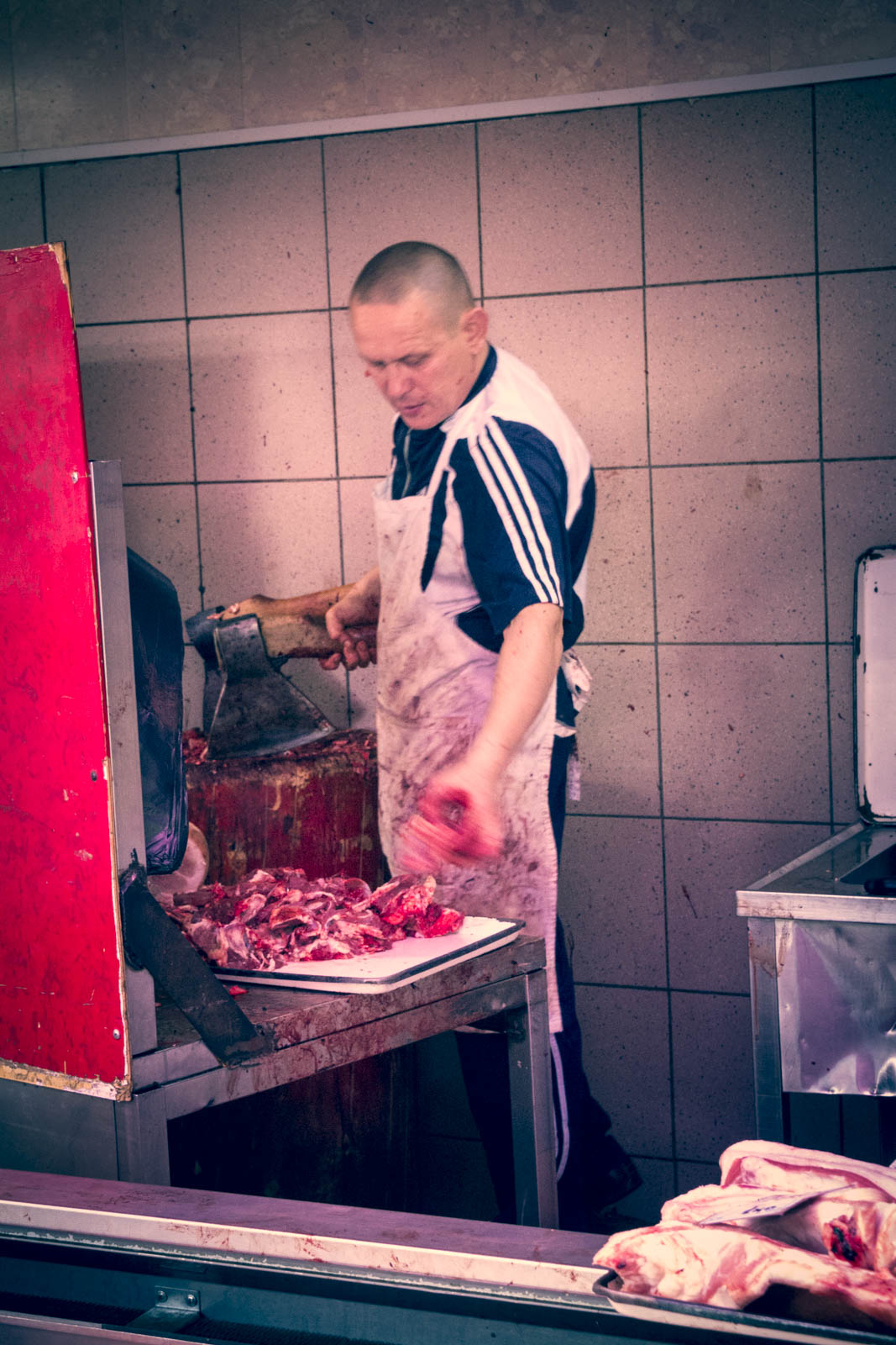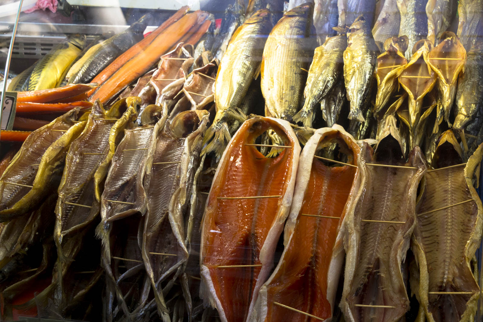 Mais surtout, la plus grande partie de la halle est occupée par les bouchers et les poissonniers. De belles pièces de viande étalées dans des vitrines sur plusieurs mètres de long, des abats, du bœuf, du poulet, du porc… Il y en a pour tous les goûts. Les jolis poissons frais en provenance des eaux du Baïkal et de ses tributaires font également saliver. Particularité, tant pour les viandes que pour les poissons, une large gamme de produits séchés et fumés est également proposée.