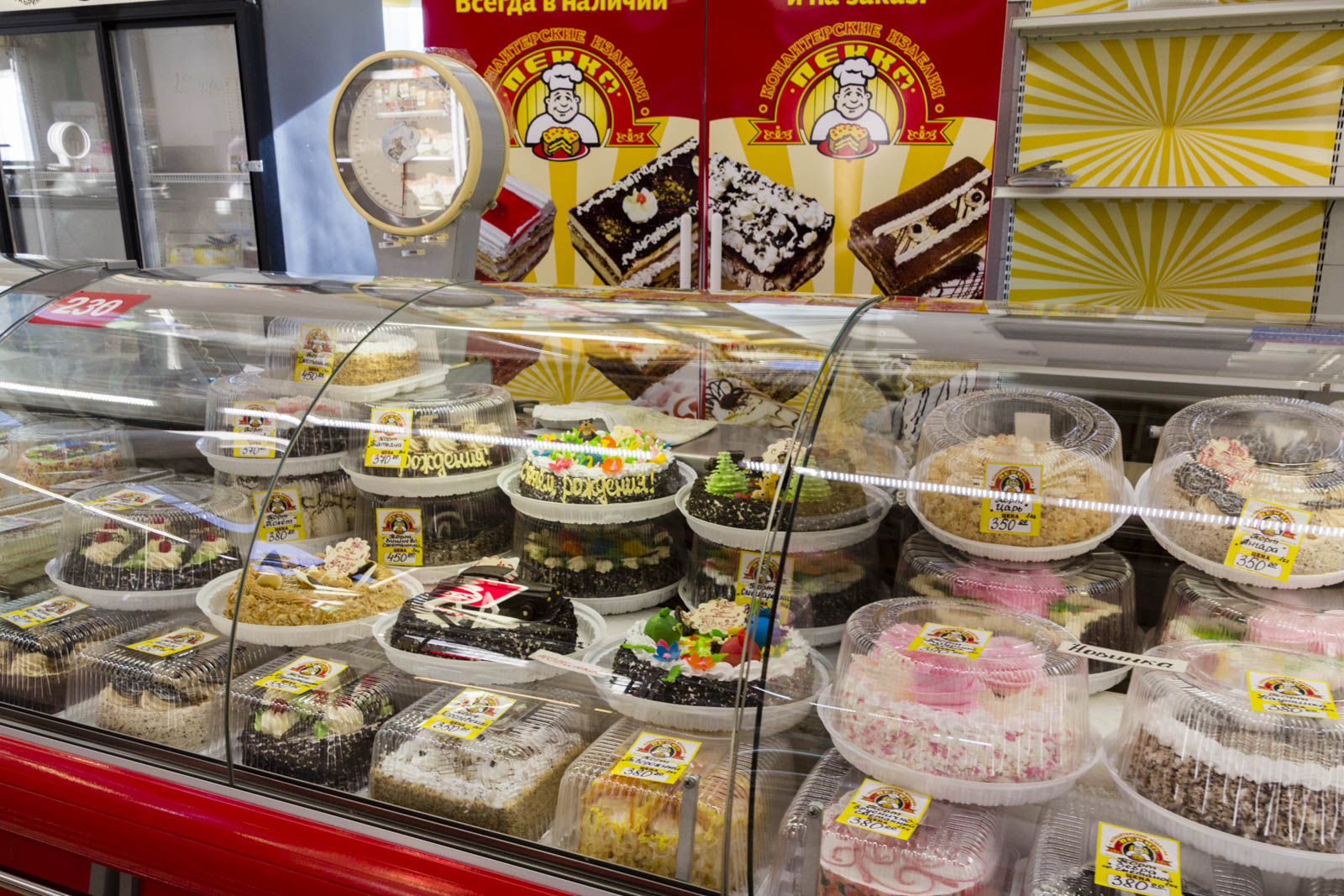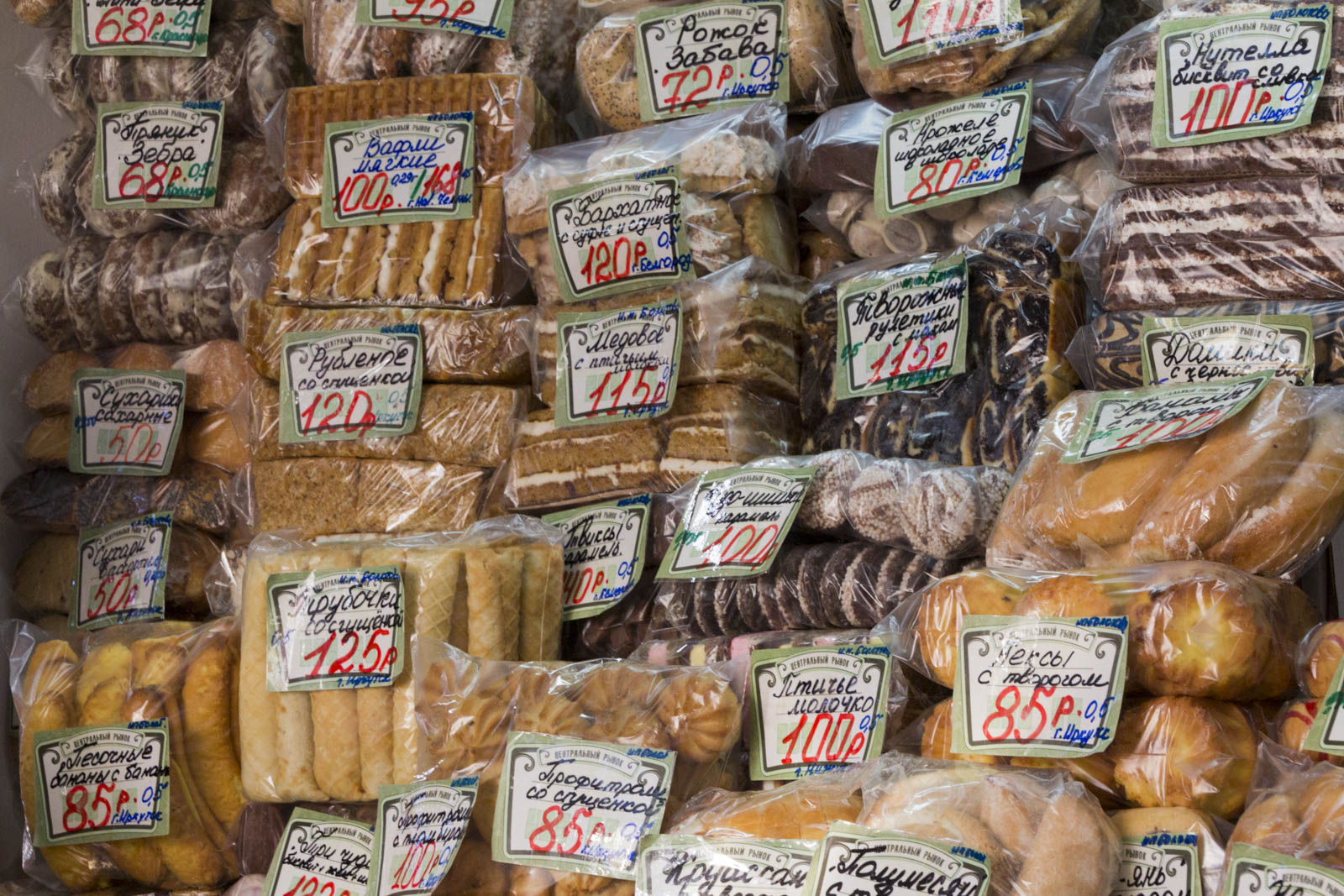 Dans la grande halle, outre le reste des maraîchers qui ne proposent pas davantage de variété, on trouve tout un tas d’étalages de gâteaux, majoritairement des génoises à la crème, et de boulangeries proposant du pain et des sortes de viennoiseries briochées russes.