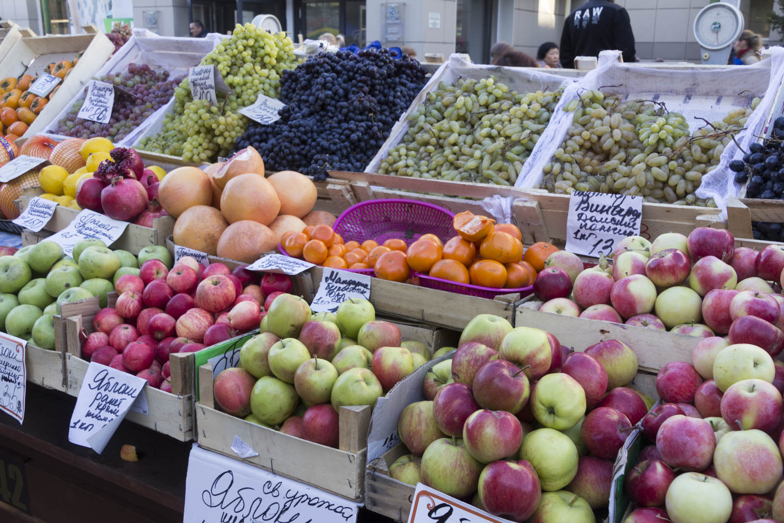 Pour les légumes, on retrouve surtout les basiques de la cuisine russe : des pommes de terre, des carottes, des betteraves, des oignons et de magnifiques choux, bien ronds, bien propres, aux feuilles extérieures en excellent état. On a aussi parfois quelques tomates, concombres, poivrons…