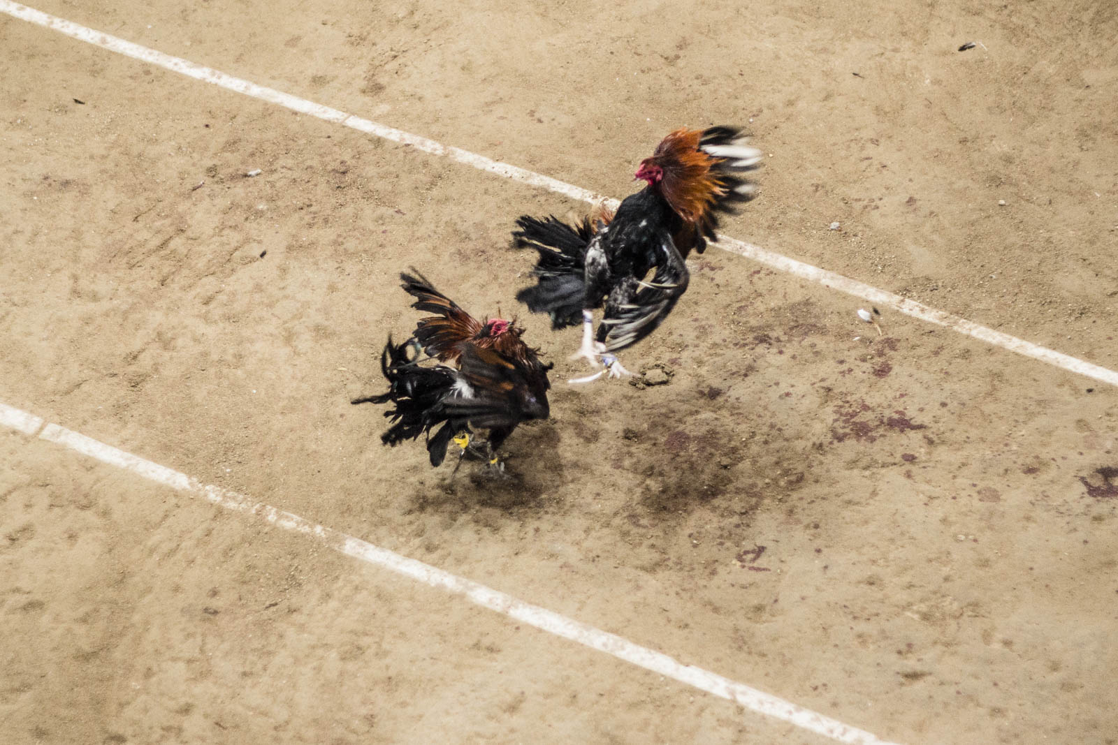 Devant l’entrée, ils sont nombreux à être venus avec leur coq, fièrement tenu dans leurs bras en attendant que leur protégé aille en découdre dans l’arène. Il y a aussi les entraîneurs de coqs, des hommes qui sont payés par des propriétaires de coqs pour transformer leurs volailles en machines de guerre. Mais pas le temps de s’attarder ici, car on nous annonce que les combats ont démarré dans l’arène. Moyennant 30 pesos (0,6 €) chacun, on pénètre dans un gallodrome assez grand mais désuet, tout de béton et de bois. La plupart des hommes sont amassés en bas des gradins, au plus près de l’arène, un carré de terre battue entouré de parois transparentes qui occupe le centre du cockpit.