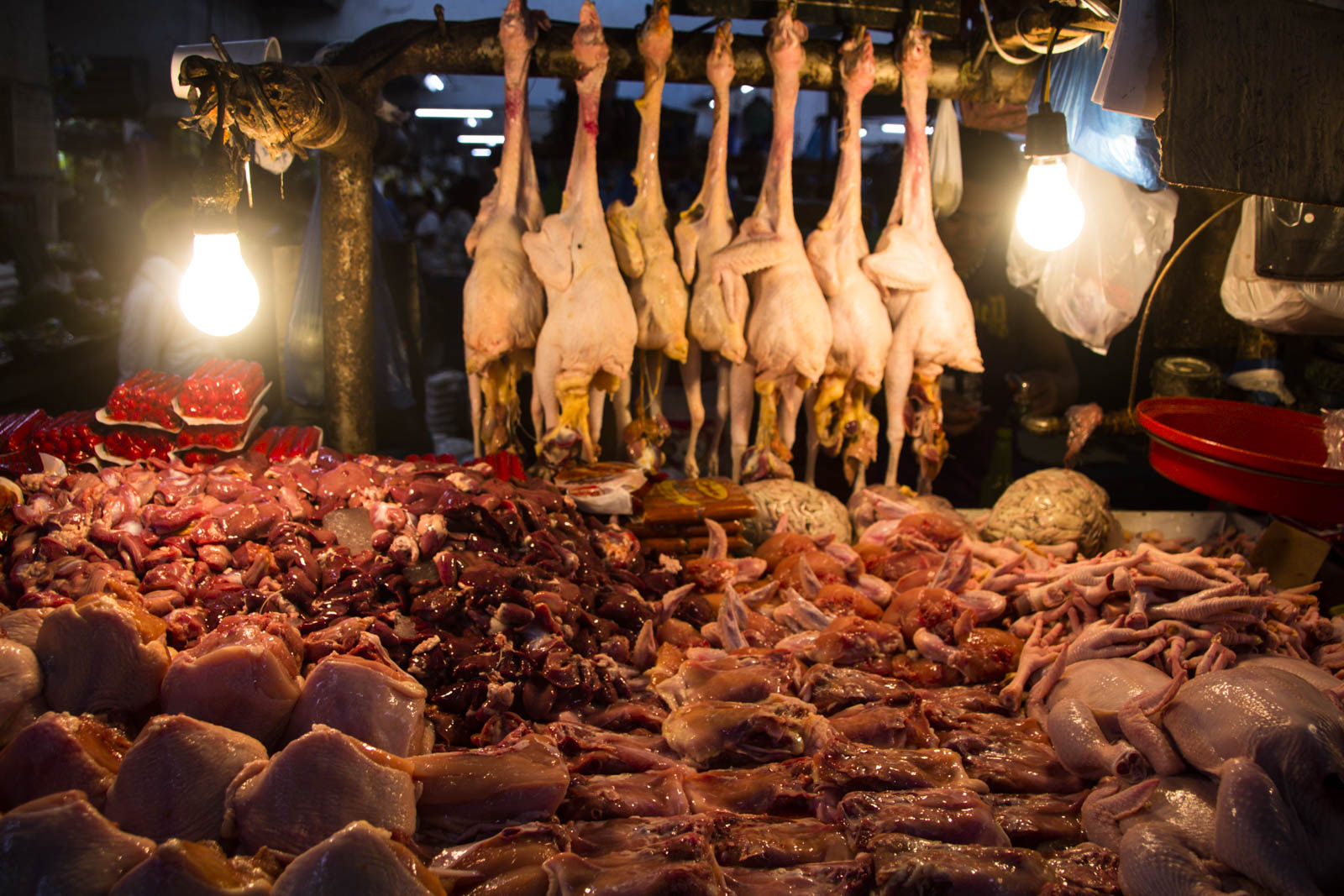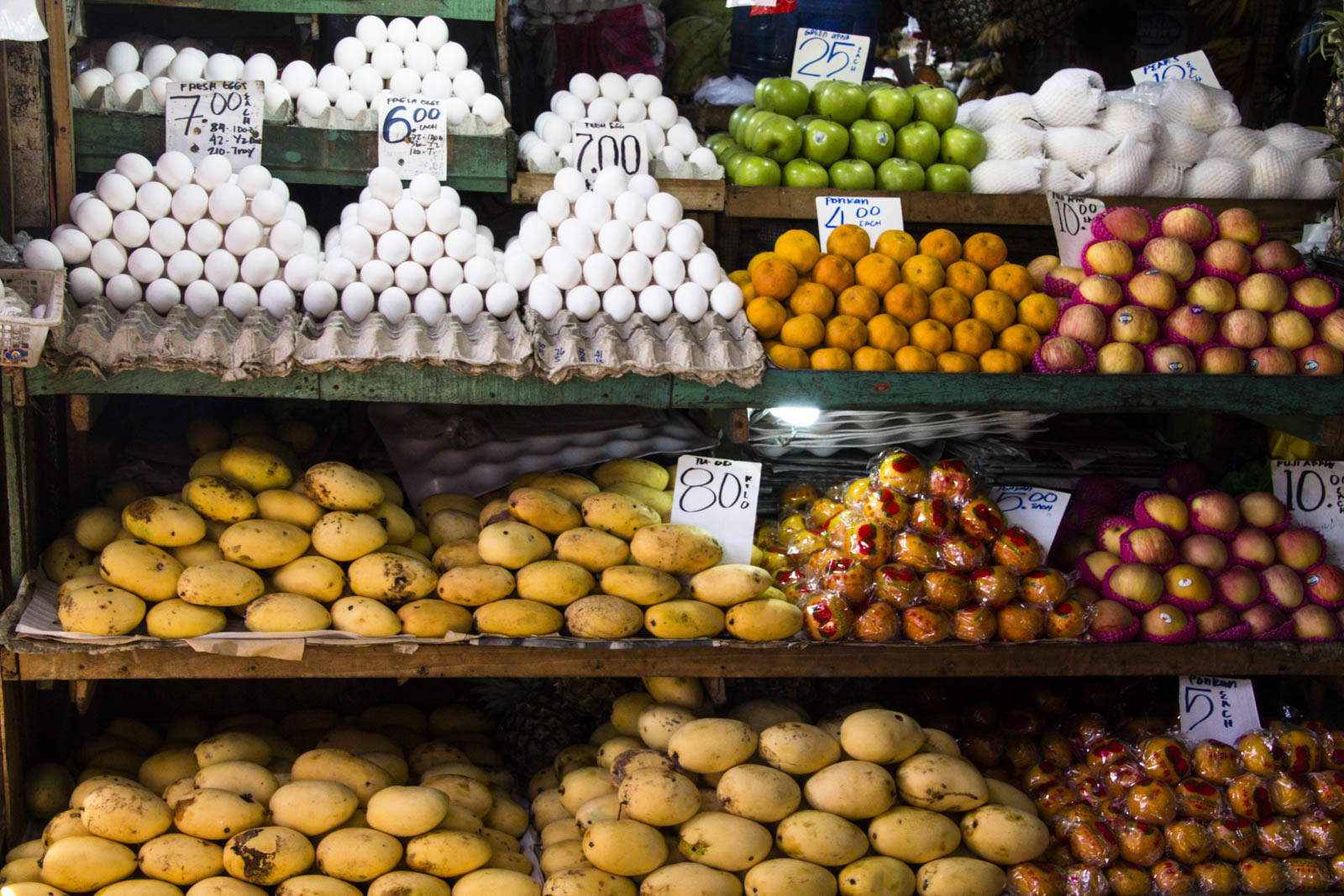 Tout autour de la grande halle, c’est d’abord toute la richesse fruitière des Philippines qui se rappelle à nous. Une profusion de bananes, d’ananas, de mangues jaunes, de papayes, de pastèques, de mandarines vertes, de fruits du jacquier parfois énormes, de kalamansi (calamondin en français), ces petits citrons verts au goût proche de la mandarine acide très usités dans la cuisine locale, mais aussi des poires et toute une gamme de pommes. Sans oublier, au milieu de tout ça, les œufs !
