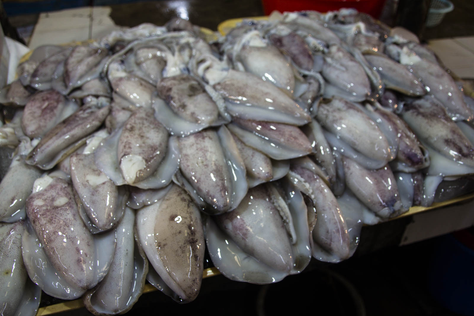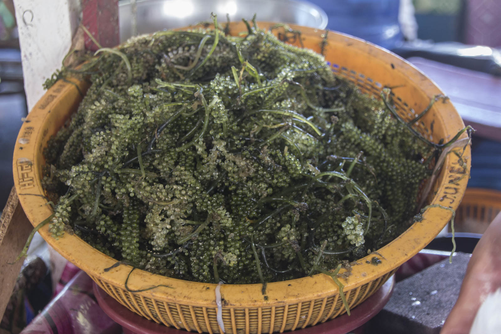 Puis on passe sous les halles, découvrir les produits frais du coin. En cette matinée, les étals de poissons sont particulièrement attirants. Surtout en comparaison de ce qu’on a vu juste avant sur la plage de Mocpoc Norte. On y vend de beaux poissons frais, de taille raisonnable pour une ou deux personnes, notamment un magnifique poisson aux écailles bleues, ainsi que des petits calamars, des coquillages, des crevettes et des crabes, dont certains avec de belles pinces bleues. Au milieu de ces étals, des petits seaux remplis d’algues à la texture perlée, comme des œufs de poisson. On succombe à la tentation d’y goûter, et c’est étonnamment bon : ça a bien la texture d’œuf de poisson, et le même goût salé, mais avec une agréable note végétale.