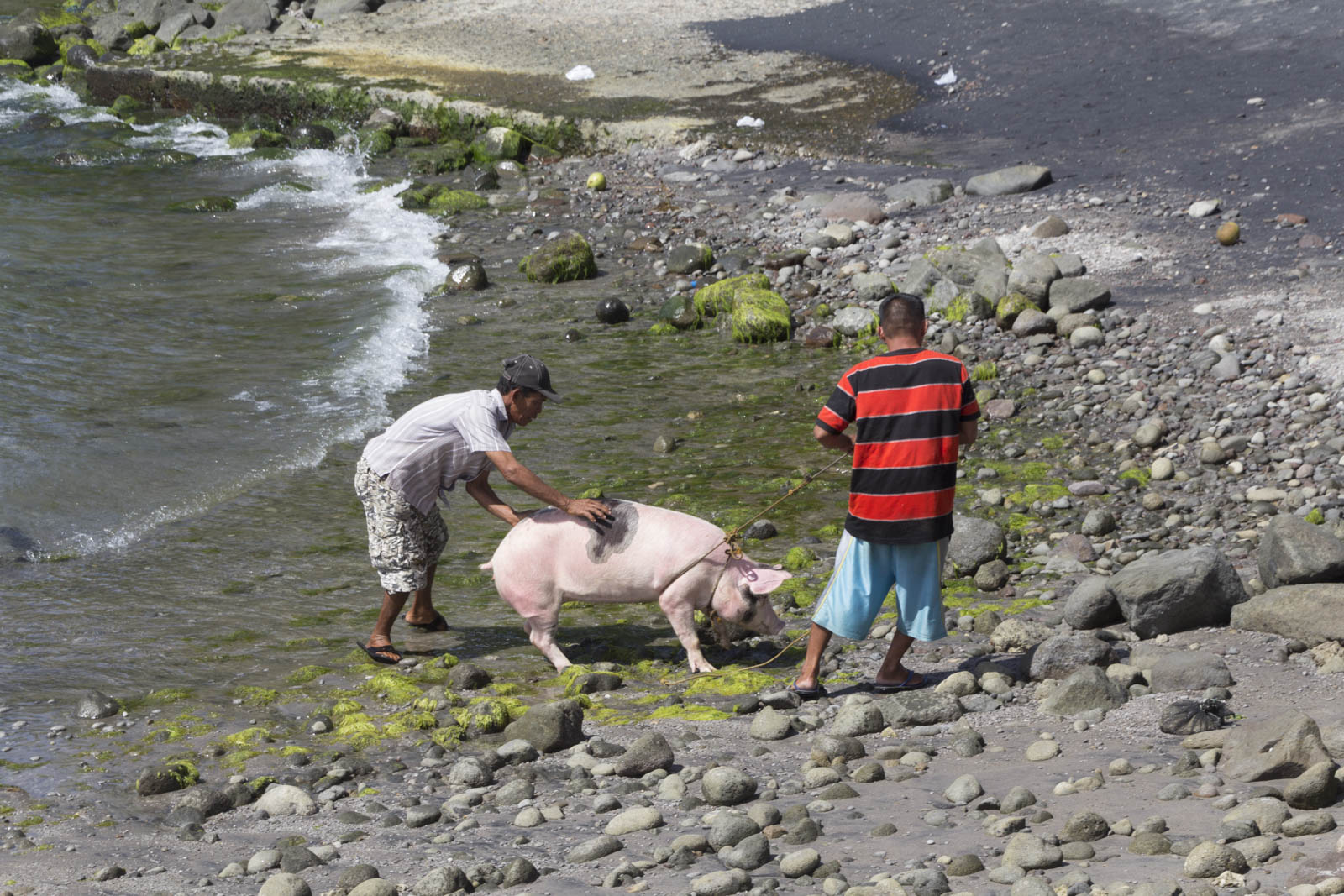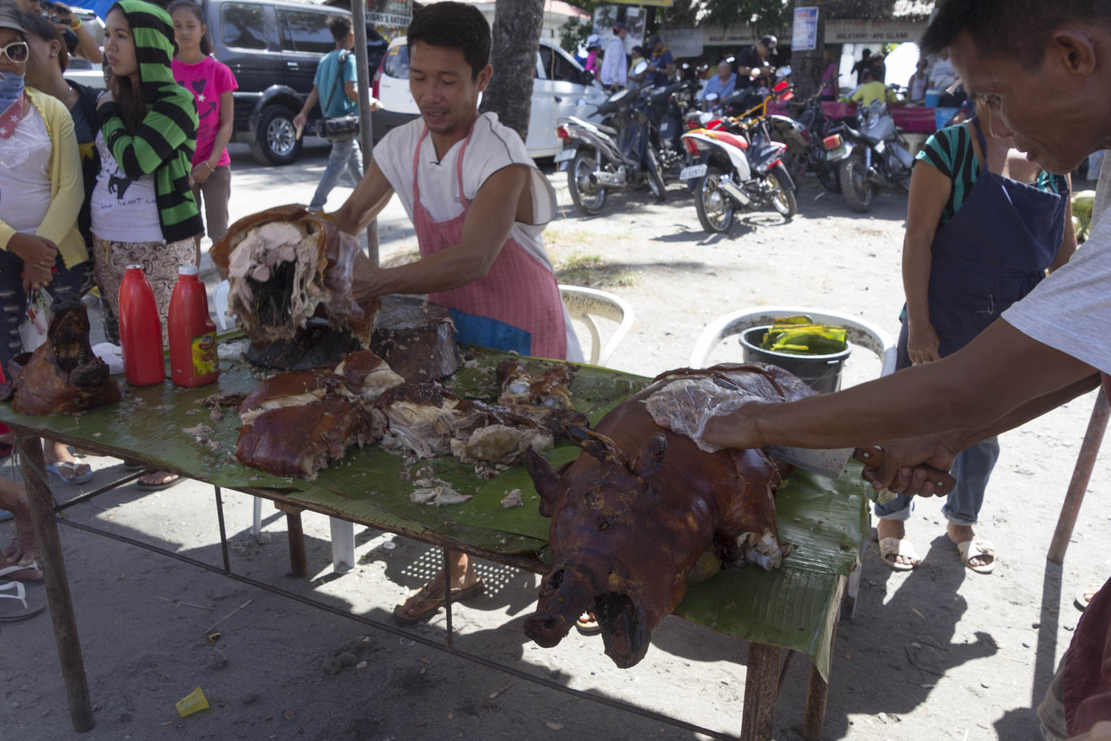 Mais il faut persévérer, car la récompense est au bout ! A côté de la foire au bétail se sont installés les stands de lechon baboy, le cochon de lait à la broche, à la mode Philippine. Et à 400 pesos (8€) le kilo de cochon grillé, il y a moyen de bien se faire plaisir. Sans compter la noix de coco à 50 centimes, tout comme le halo-halo (dessert à base de glace pilée)… Et après un tel festin, pourquoi ne pas profiter gratuitement de la belle plage de Malatapay? Les fonds marins ne sont peut-être pas aussi jolis qu’à Apo, mais l’eau et le front de mer sont tout aussi agréables. Surtout quand on y est seul. C’est sans doute ce qu’a dû se dire ce cochon qui s’est fait la malle, au plus grand désarroi de ses propriétaires !