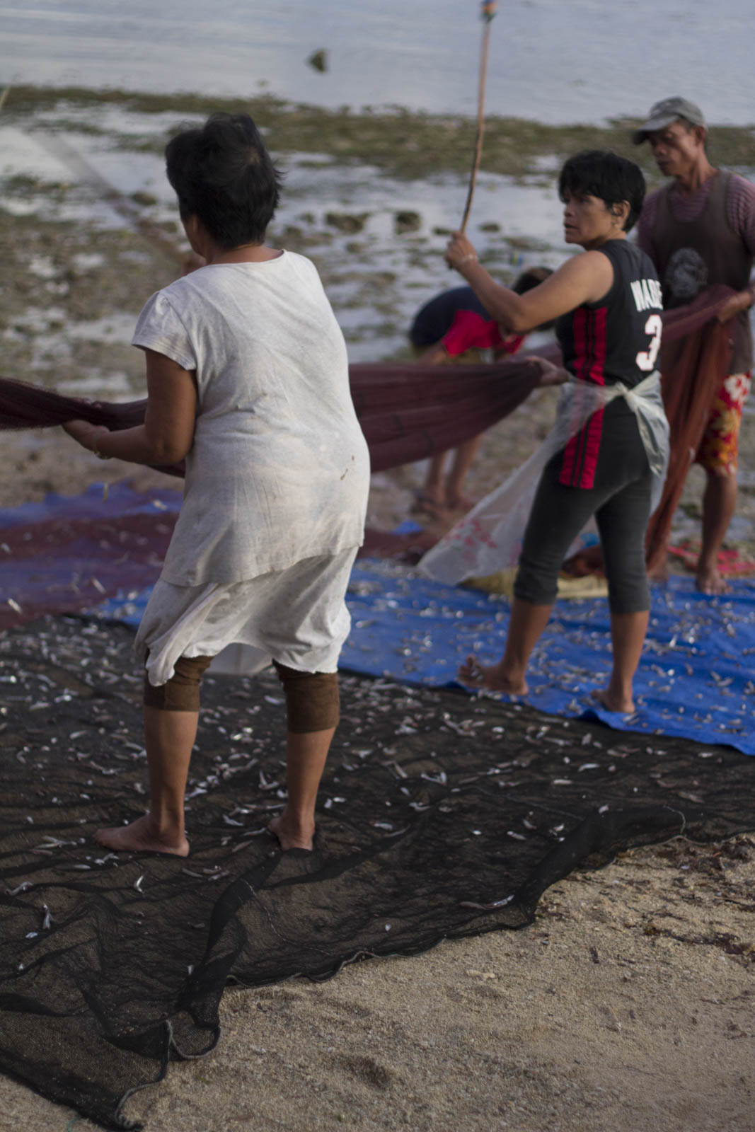 Les pêcheurs déroulent leurs filets en tapant dessus avec des bâtons de bois pour faire tomber les poissons piégés dans leurs mailles. On est de suite très surpris par la taille des poissons ramenés. Ils sont vraiment minuscules, plus petits que des anchois ou des sardines. Il faut dire que les pêcheurs du coin s’affranchissent allègrement des réglementations en matière de gabarit : ils utilisent deux filets superposés pour diviser la taille des mailles par quatre, et ainsi attraper les plus petits poissons, de la taille de gros alevins. En même temps, il ne reste plus beaucoup de gros poissons adultes dans les eaux de la baie de Sandingan. Et puis, à quoi bon s’embêter à aller en pêcher plus loin, vu que les habitants du village n’auront pas les moyens de les payer ?