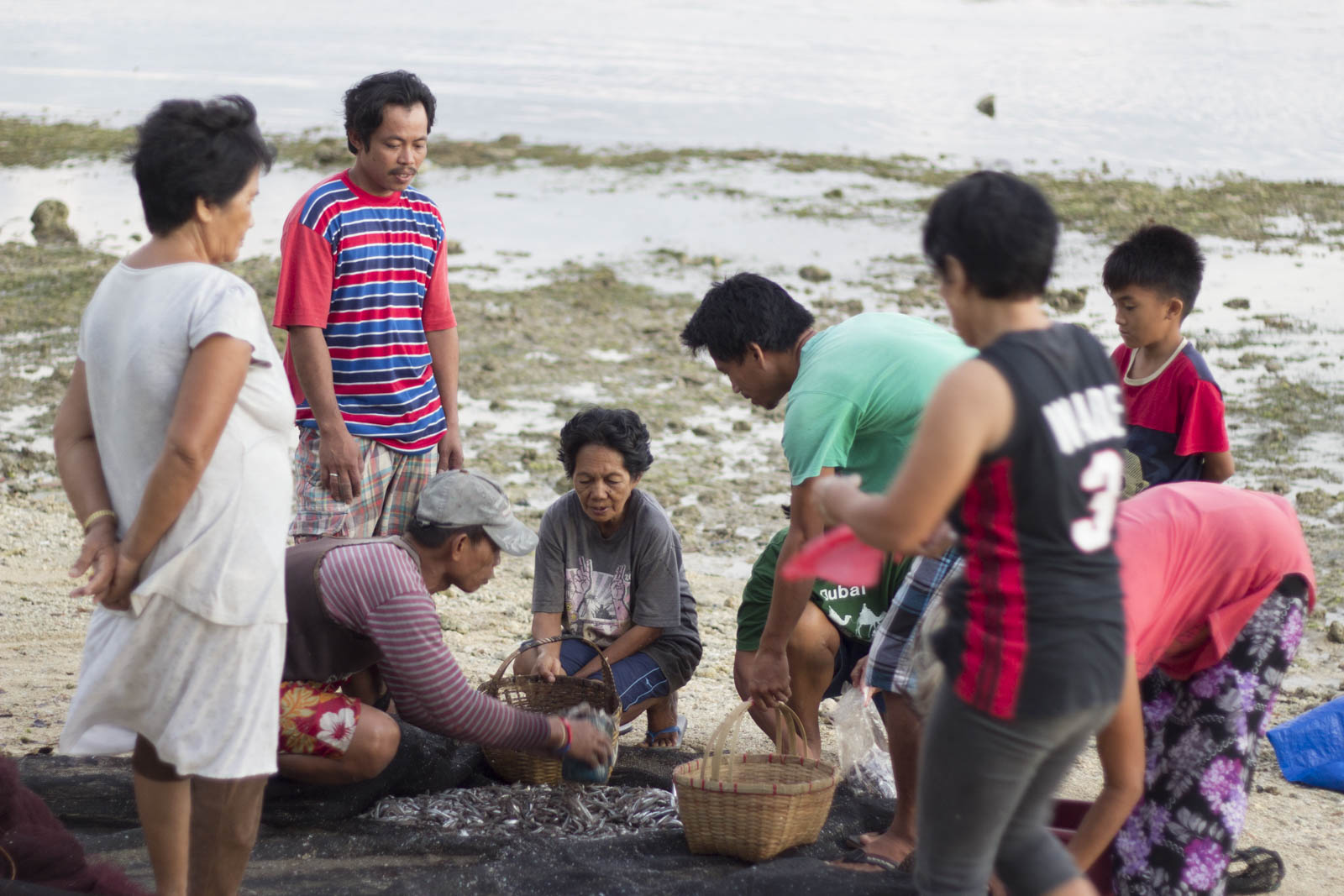 Outre la taille des prises, le maigre butin ramené ce matin-là nous frappe également. Les petits poissons sont ramassés à l’aide d’un vieux bidon d’huile moteur ouvert sur le dessus, appelé Caltex du nom de la marque du bidon d’huile. Le poisson est vendu par Caltex, volume correspondant à un peu moins d’un kilo. 35 pesos le Caltex (0,7 €). Aujourd’hui, chaque bateau a ramené une quinzaine de Caltex. Ca nous paraît ridicule, mais aux dires des locaux, c’est plutôt une bonne nuit : il faut dire que l’on approche de la nouvelle lune. Avec l’équivalent de 10 € gagnés pour chaque bateau, les pêcheurs du village peuvent maintenant aller se reposer, et partager avec leur famille leur Caltex quotidien de petits poissons, « dégustés » simplement crus, séchés ou grillés, avec éventuellement un peu de riz. Et puis, au crépuscule, ils repartiront pour une nouvelle nuit dans les eaux de la baie de Sandingan…