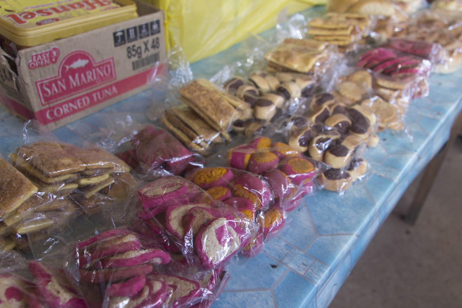 On vend également de nombreuses sortes de pains et gâteaux, plus ou moins secs. Certains sont faits à partir d’une racine très étrange, appelée tao, assez tendre mais surtout super grasse. On se laisse tenter, mais c’est aussi fade que gras… on ne nous y reprendra plus !