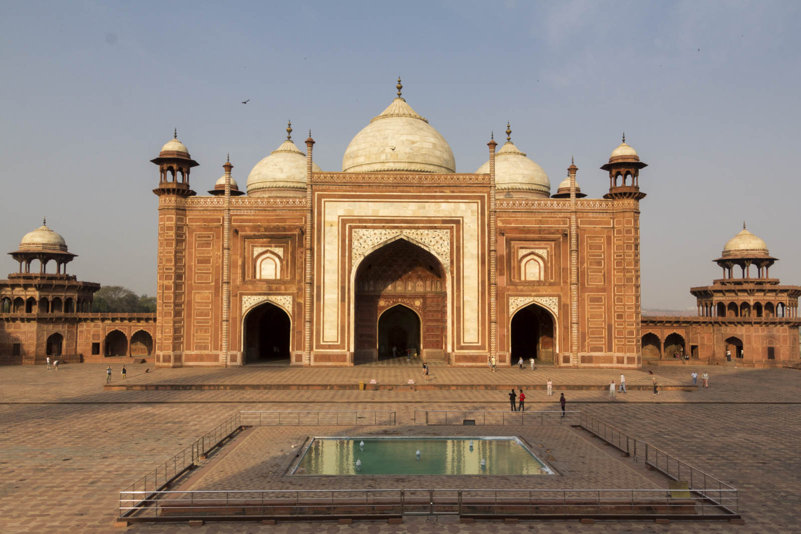 Puis vient le jour où on y pénètre pour de bon, à travers sa grande porte de grès rouge. Une porte qui symbolise la frontière entre le monde des vivants et le paradis céleste, le Taj Mahal. C’est bien le cas. Derrière la porte, on n’est plus à Agra. On est dans un magnifique jardin où le vert de la végétation, le bleu des bassins et le blanc du mausolée se marient… merveilleusement. Même avec les fontaines qui ne marchent pas et trois minarets sur quatre en réparation, cette vision céleste nous laisse sans voix ! Nouvelle claque.
