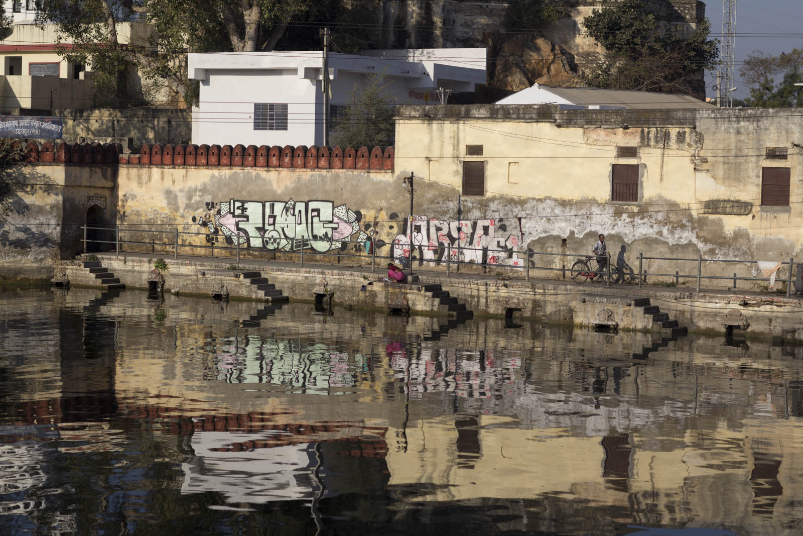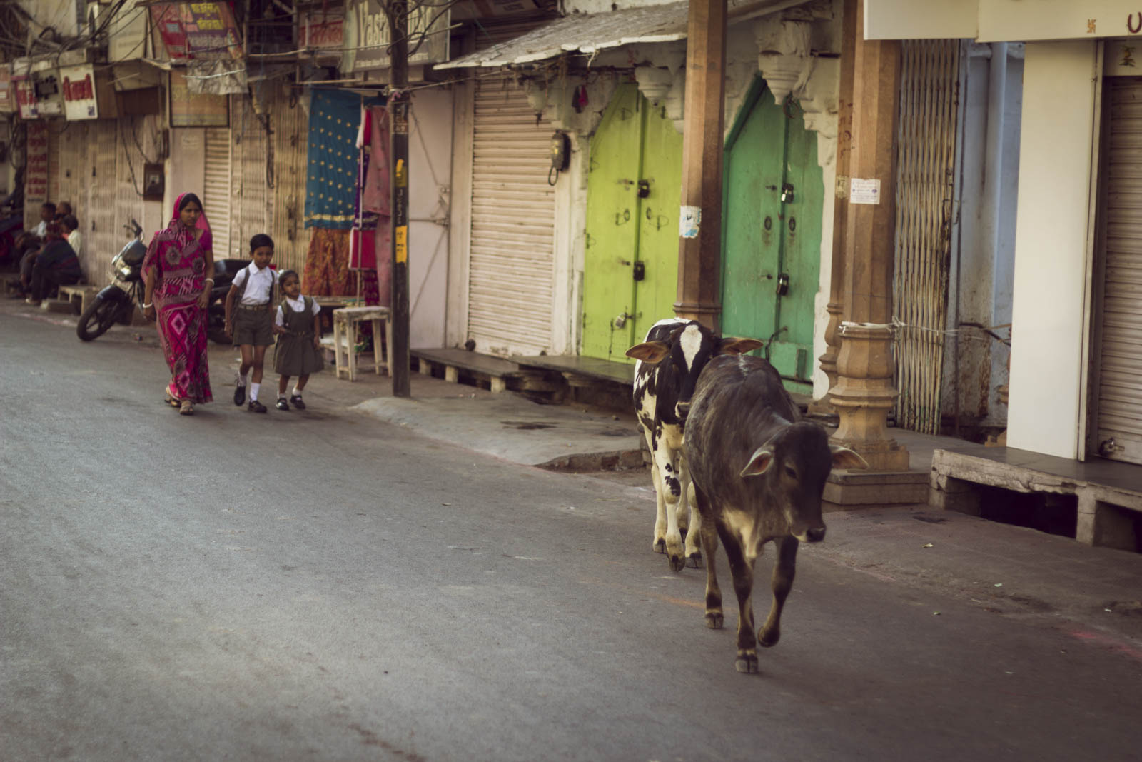 A l’aube, dans les ruelles escarpées de la ville, on observe avec beaucoup de curiosité les activités matinales des locaux. Des hommes se lavent dans les eaux du lac Pichola, des femmes viennent y faire leur lessive et des fidèles dispersent du grain pour nourrir vaches et pigeons.