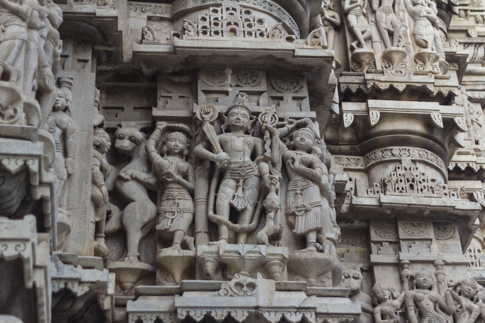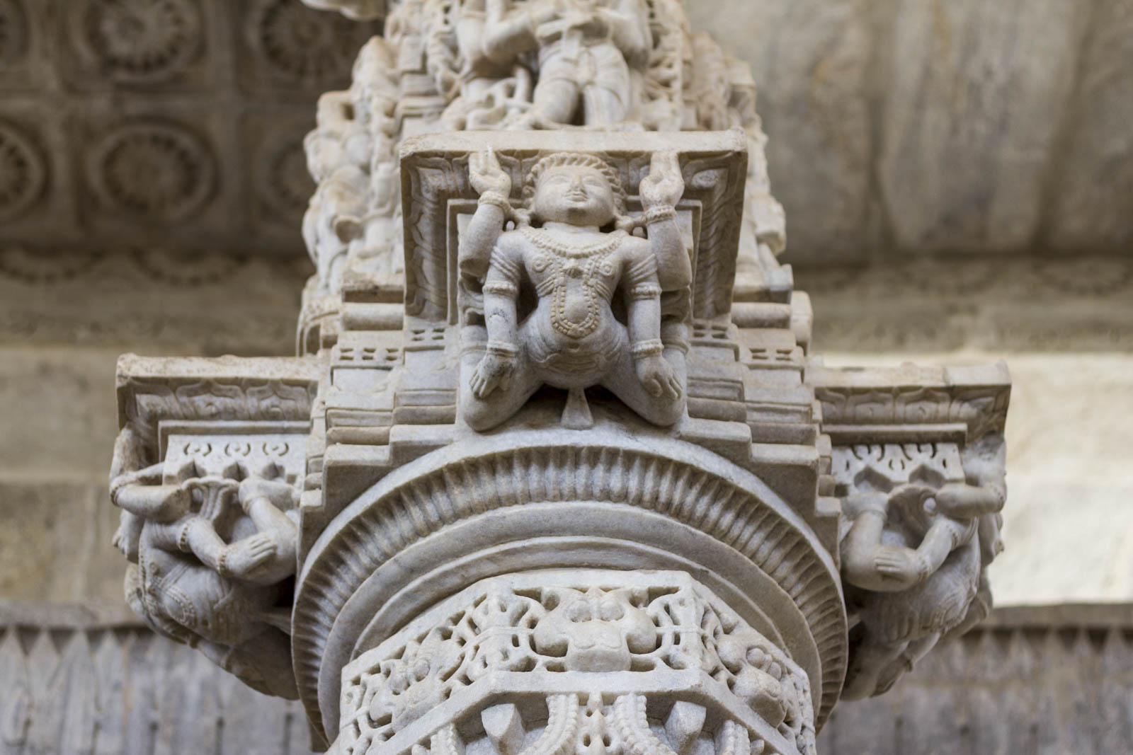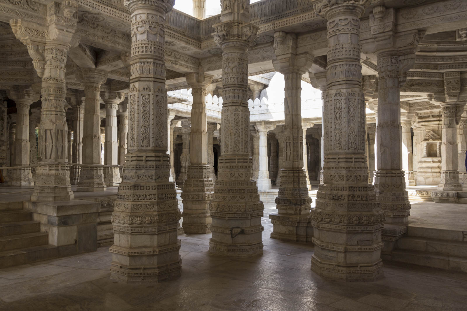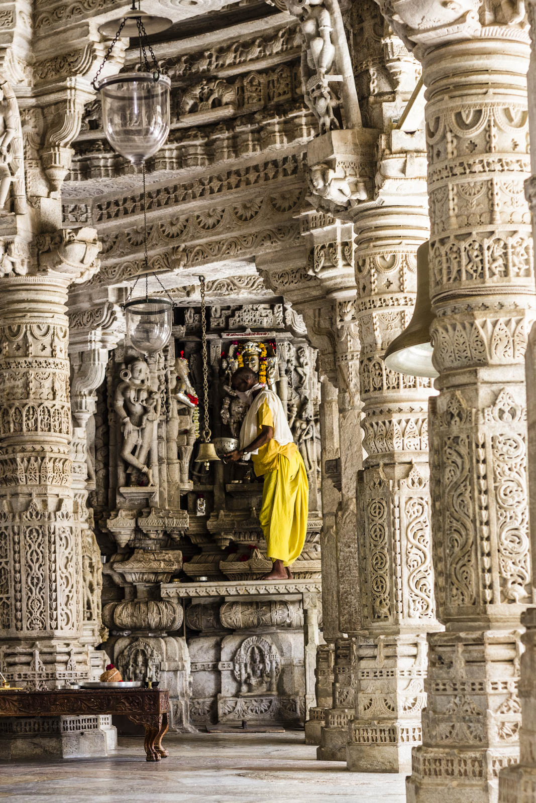 En route vers Ranakpur, une Inde plus sauvage se dévoile. On croise des singes, des dromadaires, des chevaux, des ânes, des vaches, des chèvres, des chiens, des cochons, des écureuils, des furets et un grand nombre d’oiseaux. Mais l’essentiel est au bout du chemin, lorsqu’on s’émerveille face au temple jaïn de Ranakpur. Le jaïnisme est une religion à part entière qui compte environ 14 millions de fidèles, majoritairement en Inde. Une religion à la fois simple et saine par ses préceptes mais extrêmement complexe par sa conception de l’univers. Tout cela est évoqué de manière passionnante dans l’audioguide, qui nous fait aussi découvrir toutes les merveilles que recèle ce temple, tout en frises, colonnes (plus de 1400 !) et coupoles très finement sculptées. Dieu que c’est beau !