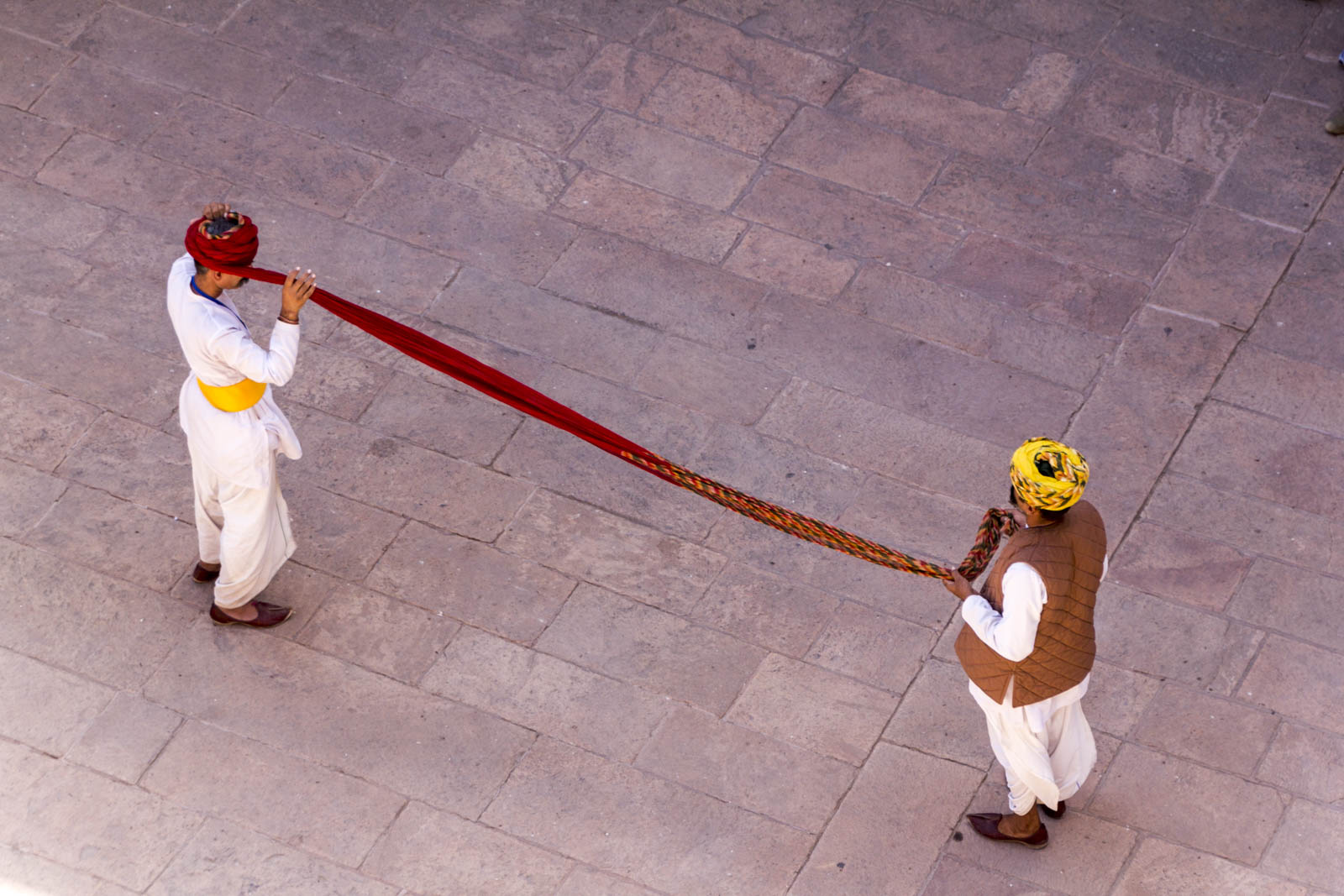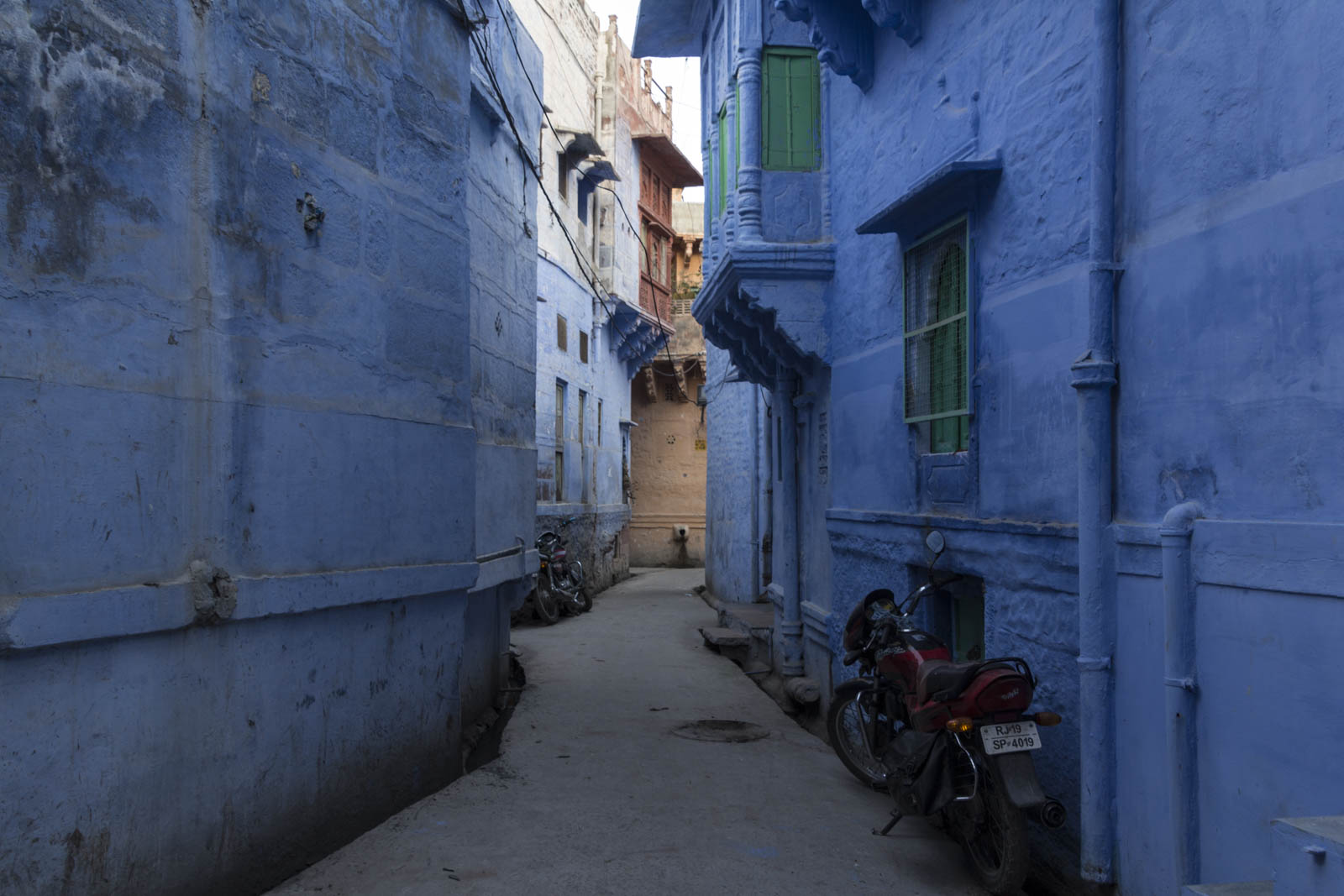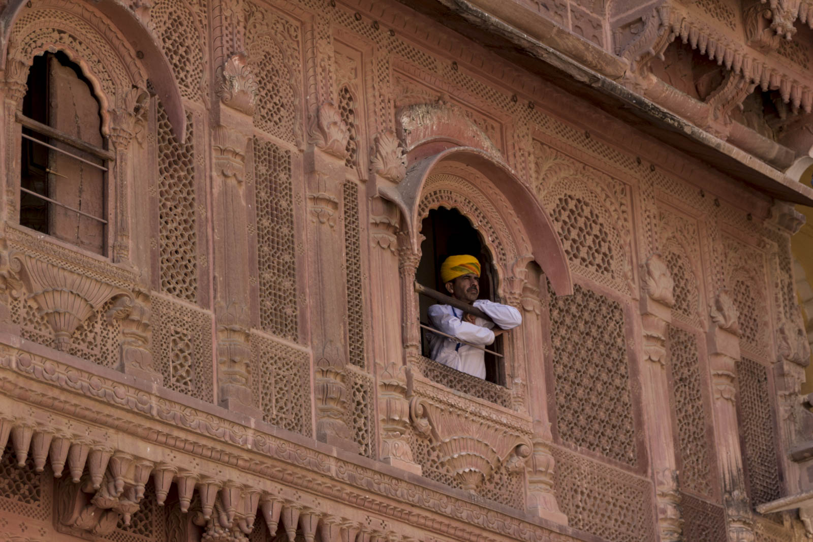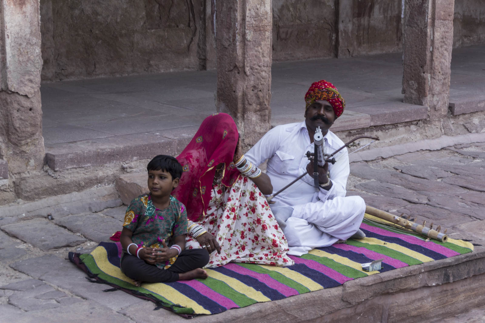 Le temps passe tellement vite qu’on arrive déjà à Jodhpur, notre dernière étape avant d’aller travailler à l’ashram. La forteresse imprenable de Mehrangarh, bâtie sur une colline, domine, écrase, toute la ville bleue. A l’intérieur, un nouvel excellent audioguide nous en apprend beaucoup sur la dynastie qui règne, aujourd’hui encore, sur le Marwar. Comme depuis le début de nos visites en Inde, on est ébahi par le contraste entre la finesse des détails sculptés dans les pierres et le caractère extrêmement massif des bâtiments qui les abritent. Un somptueux mélange de marbre blanc et de grès rouge qui nous a encore émerveillés une bonne partie de journée.